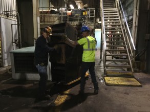FCM employees remove a rusted carbon steel filter rack at International Paper’s mill in Mansfield, La. (Photo by FCM Products, Inc.)